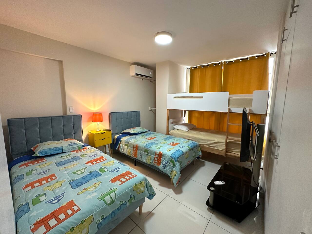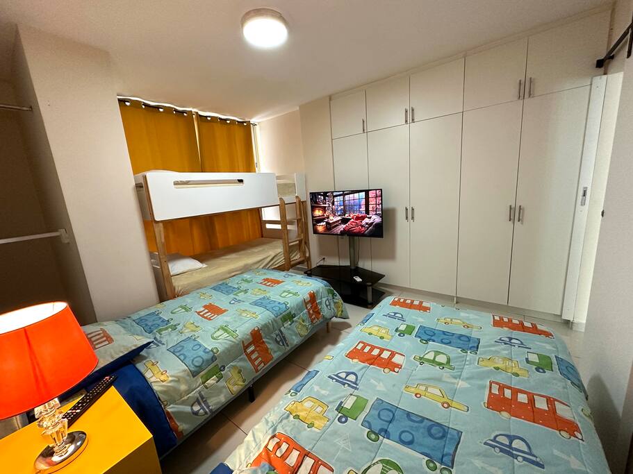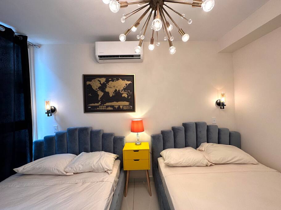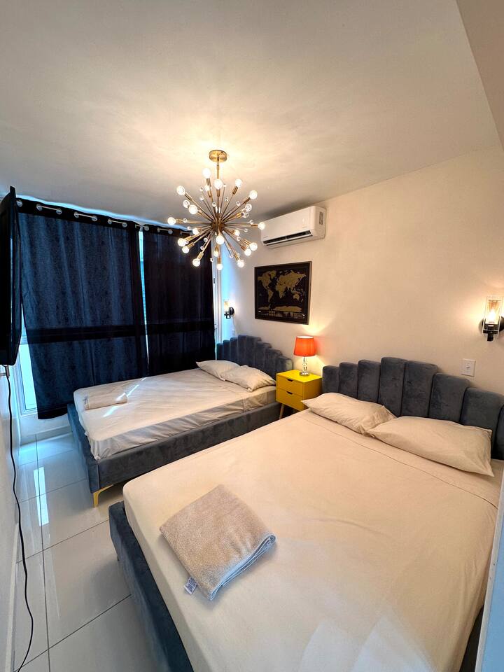 4Bed Room Suite Master Bedroom - 1 Queen Bed Room# 2 - 2 Full Beds Room# 3 - 2 Twin Beds + Canopy Bed that includes 2 Twin Beds. Room# 4 - 1 Full bed (This room is a small room). All the Rooms include: -A/C -SMART TV -CLOSET SPACE Bathrooms: - 3 Full bathrooms Kitchen: Fully Equipped kitchen Wifi: High Speed Wifi in all the Apartment. Furniture: Brand New state of the art furniture . Balcony. Cribs & Additional Mattresses (Available). Building Includes: - High Speed Elevator. - Stairs. - Security: Gated Security and Camaras. - Roof top Terrace, includes Jacuzzi, sun deck, bathroom. - Free Parking inside the property. And much more! .
