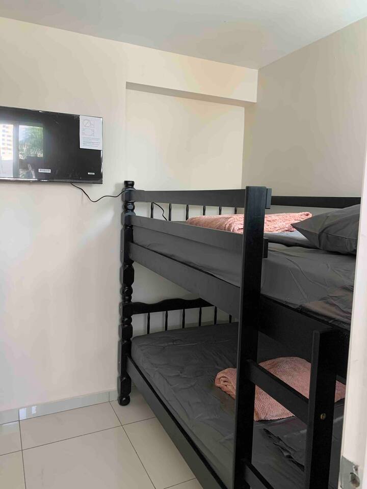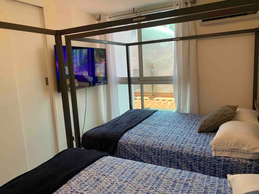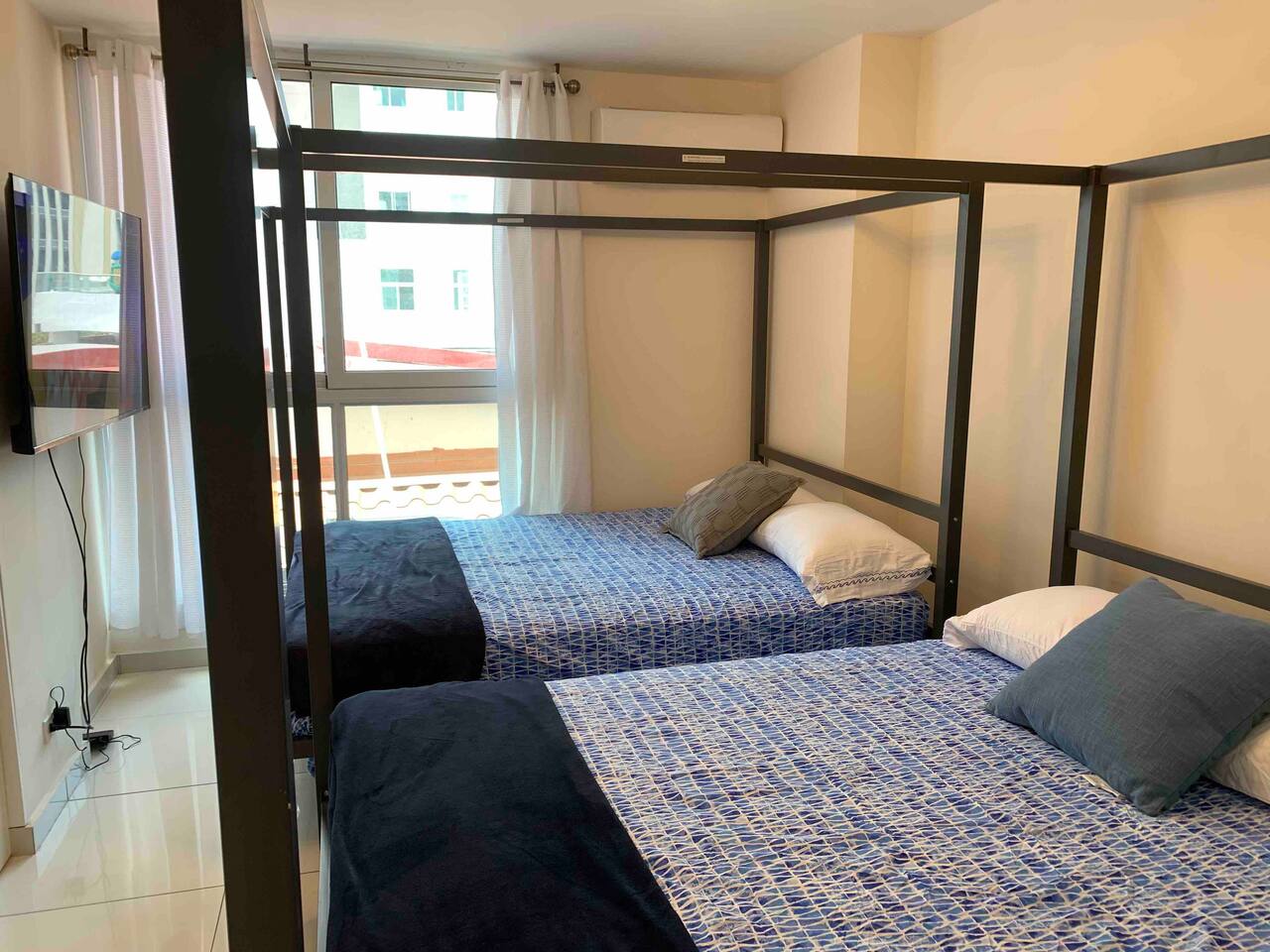 4Bed Room Suite Master Bedroom - 1 Queen Bed Room# 2 - 2 Queen Beds Room# 3 - 1 Queen Bed Room# 4 - Canopy Bed that includes 2 Twin Beds (This room is a small room). All the Rooms include: -A/C -SMART TV -CLOSET SPACE Bathrooms: - 3 Full bathrooms Kitchen: Fully Equipped kitchen Wifi: High Speed Wifi in all the Apartment. Furniture: Brand New state of the art furniture . Cribs & Additional Mattresses (Available). Balcony Building Includes: - High Speed Elevator. - Stairs. - Security: Gated Security and Camaras. - Roof top Terrace, includes Jacuzzi, sun deck, bathroom. - Free Parking inside the property. And much more! .